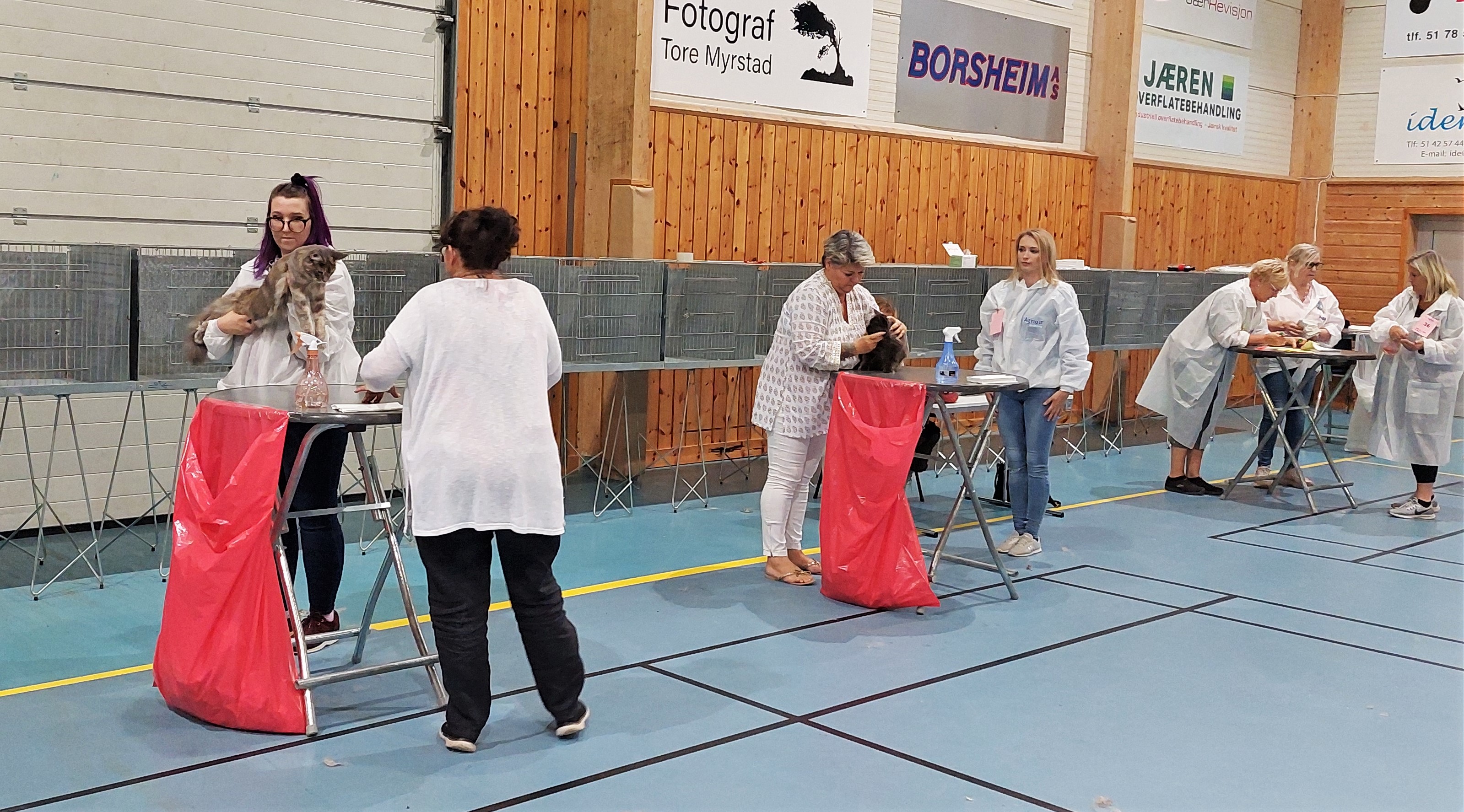 Kategori 2 og huskatt stilte om søndagen. Det var to parallelle utstillinger i hallen, en på hver sin kant av hallen. Utstilling blå og utstilling gul.