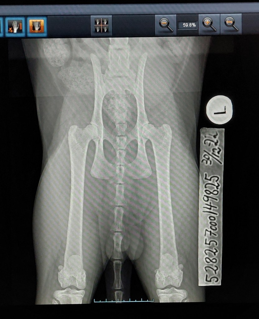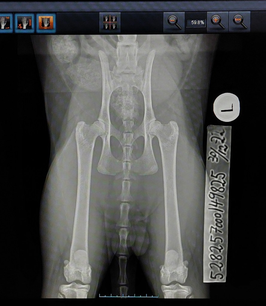 Jeg brakte også med meg Rigo sammen med Nylah for hofterøntgen. Jeg synes at hans hofter ser relativt lovende ut og våger derfor å håpe på frie/normale hofter. Fingre og tær krysses i hvert fall for gode resultater. Hans bilder har også blitt sent til PawPeds for avlesing. – Rigo måtte ta nye bilder pga feil ID-teip på hans bilder.