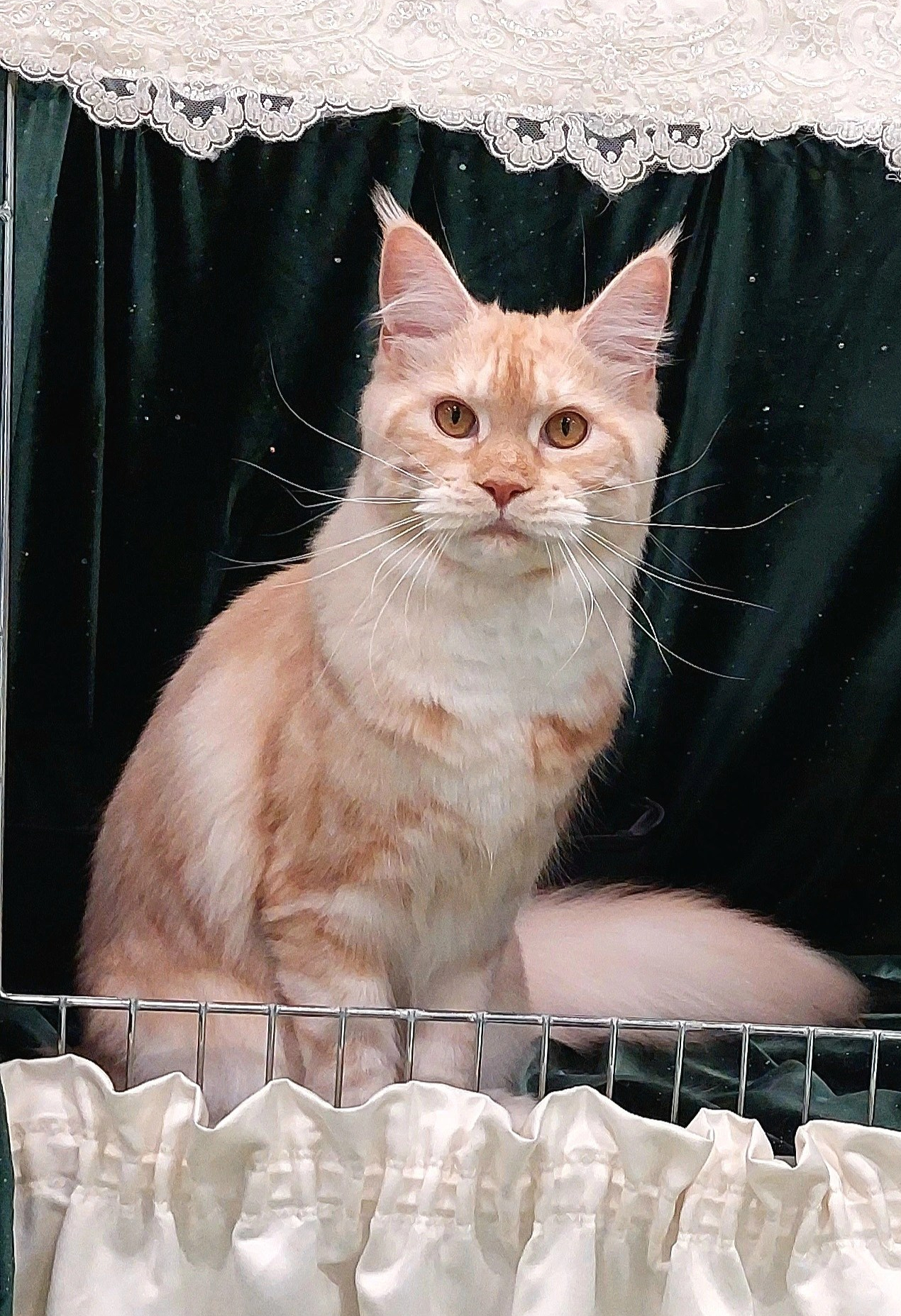 | Grand International Champion (GIC) 12.06.2022- Color: Red smoke with white, EMS: MCO ds 09 COI: 13,2% Top 5: 67,7% Clones: 34,6% HCM1, PK-def, SMA: N/N Bloodtype: N/N HD x-ray: GOOD (OFA) HCM-screening: Offspring: E-litter Genetic: aa, Dd, OO, wsw, M4M4 | ![]() |