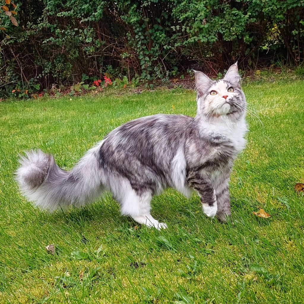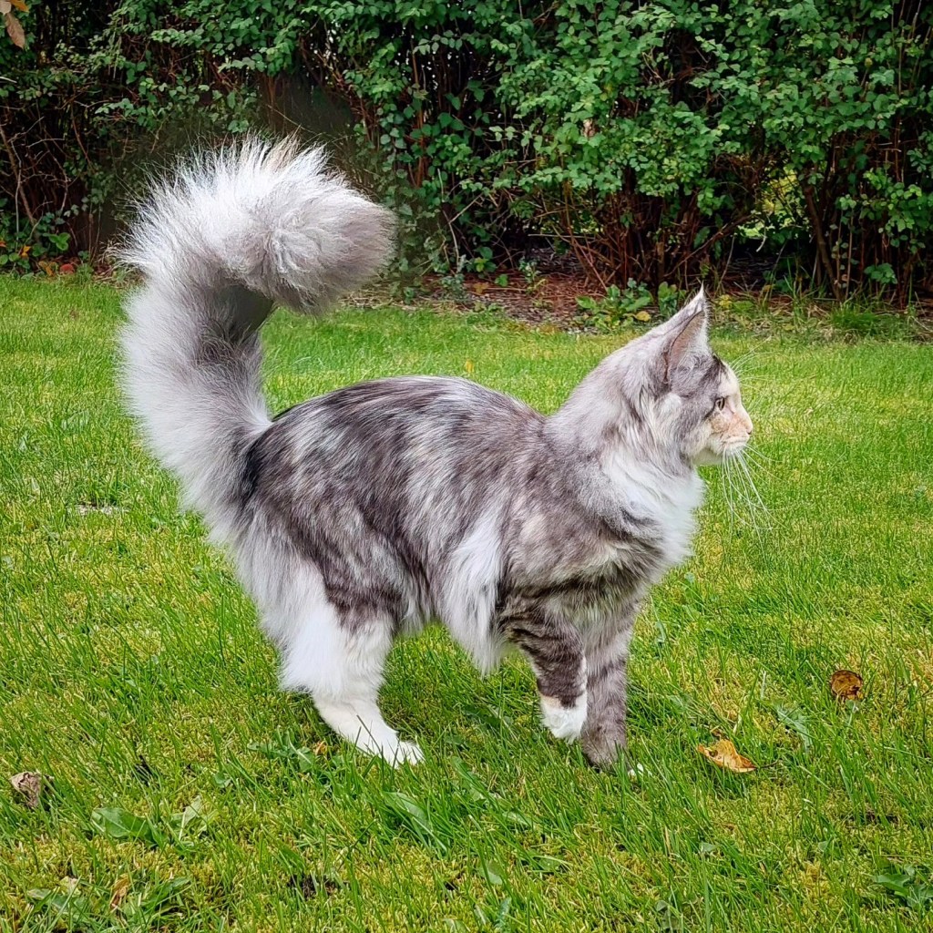 Hun er en stor hunn med mediumsterk benbygning. Jeg elsker uttrykket hennes som er mildt, ikke ekstremt, med et åpent blikk og et mer beskjedent og «sweet» uttrykk enn morskt. Hun minner mer om den gamle typen Maine Coon, noe jeg jobber bevisst for i mitt oppdrett.